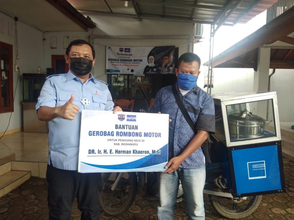 Anggota Komisi VI DPR RI, Dr Ir HE Herman Khaeron MSi membagikan gerobak rombong motor bagi pedagang kecil (UMKM) di Kabupaten Indramayu, Jumat (22/1), di Jatibarang Kabupaten Indramayu.